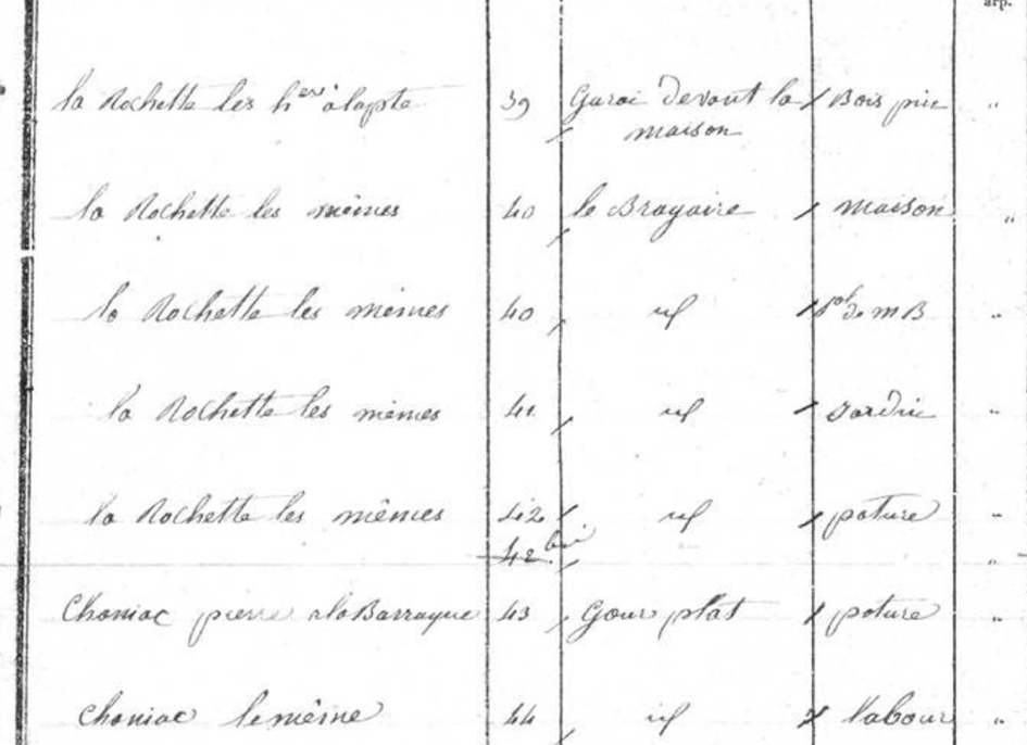 Nous remontons quelques années avant même le creusement du trou, nous ouvrons l’état des sections du cadastre napoléonien de Grazac, établi en 1835, nous y trouvons un lieu dénommé Le Bragaire 1. Dans ce document, Le Bragaire désigne un ensemble foncier constitué d’une maison, d’un jardin et d’un pâturage ; c’est un modeste domaine agricole. C’est depuis ce lieu que sera creusé le trou dit de Bragaïre. Sa situation sur une rive du Lignon l’expose effectivement à des inondations, comme le rapporte le récit d’Elodie Roche.